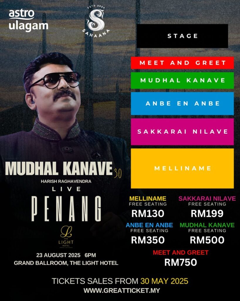 பினாங்கு, 28 மே: மலேசியாவில் பிரபல பின்னணி பாடகர் ஹரிஷ் ராகவேந்திராவின் “முதல் கனவே 3.0” என்ற தலைப்பில் சஹானா.மை நிறுவனம் ஏற்பாட்டில் பிரமாண்டமான இசை நிகழ்ச்சி நடைபெறவிருக்கிறது. இந்த நிகழ்ச்சி 2025 ஆகஸ்ட் 23ஆம் தேதி மாலை 6 மணி அளவில் பினாங்கு The Light Hotel வளாகத்தில் உள்ள Grand Ballroom-இல் நடைபெறுகிறது.