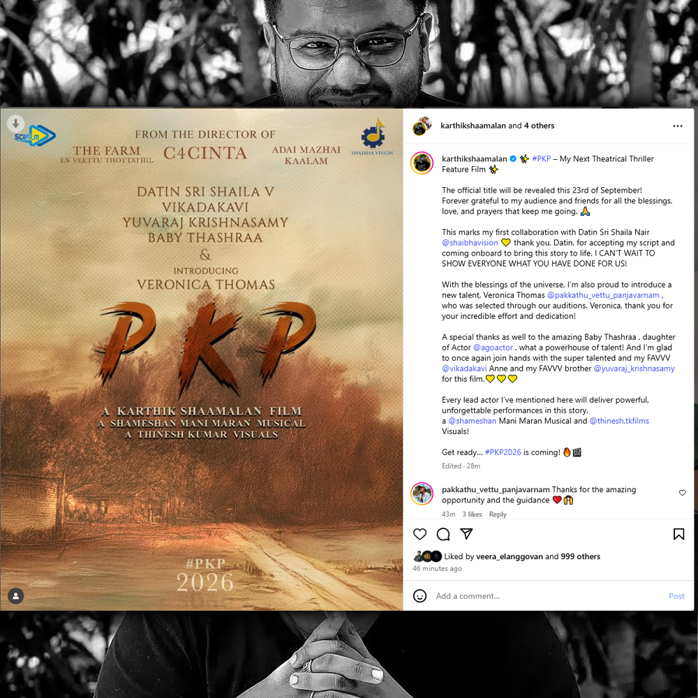 கோலாலம்பூர், 10 செப்டெம்பர் – மலேசியத் திரையுலகில் தனித்துவமான கதைகளால் தனக்கென ஒரு பெயரைப் பெற்ற இயக்குநர் கார்த்திக் ஷாமலன், தனது அடுத்த படத்தை அதிகாரப்பூர்வமாக அறிவித்துள்ளார். “PKP” என்ற குறியீட்டு பெயரில் உருவாகி வரும் இந்த படைப்பு, 2026 ஆம் ஆண்டில் திரையரங்குகளில் வெளியாக இருக்கிறது. அதிகாரப்பூர்வ தலைப்பு வரும் செப்டம்பர் 23ம் தேதி வெளியிடப்படும் என்று அவர் தனது சமூக வலைத்தளங்கள் வாயிலாக தெரிவித்தார்.