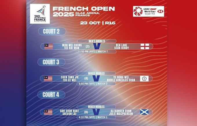இதே போல் மற்றொரு மலேசிய யுத்தம்-மிக்க்ஸ் ஜோடி Goh Soon Huat-Shevon Lai, ஸ்காட்லாந்தைச் சேர்ந்த Alexander Dunn-Julie Macpherson ஜோடியை 21-13, 21-10 என்ற ஸ்கோரில் வெற்றி பெற்று முன்னேறியுள்ளார்கள். அவர்களுக்கு வரும் நாளில் 2வது விதிக்கப்பட்ட சீன் ஜோடி Feng Yanzhe-Huang Dongping அணியை எதிர்கொள்வதற்காக மிகப்பெரிய சவால் காத்திருக்கிறது.