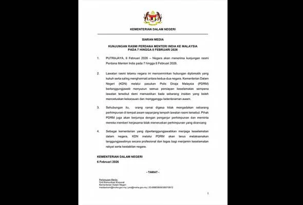 மலேசியாவின் உள்துறை அமைச்சு (Kementerian Dalam Negeri / Home Ministry) உரிய பொதுமக்கள் கூட்டங்கள் (public gatherings) மற்றும் பேரணி நடவடிக்கைகள் நடக்காதபடி மக்களை அரம்படத்துமாறு வலியுறுத்தியுள்ளது. இது இந்திய பிரதமர் நரேந்திர மோடி அவர்களின் இருநாள் அதிகாரப்பூர்வ வருகை (7–8 பிப்ரவரி 2026) முன்னதாக வெளியாகிய முக்கிய அறிவிப்பாகும்.
