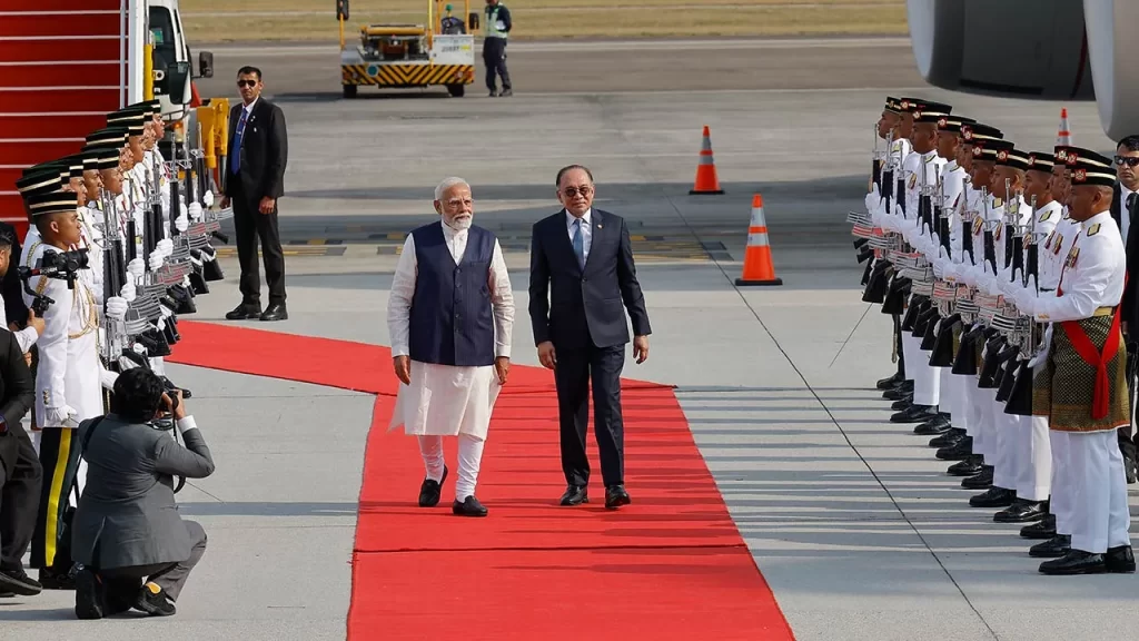 மோடியின் வருகையை கோரிக்கை செய்த பிரதமர் அன்வார் மற்றும் பல அரசாங்க உயர் அதிகாரிகள் விமான நிலையத்தில் வரவேற்று கொண்டனர். இந்த வருகை மலேசியா–இந்தியா இடையிலான இரு தரப்பு உறவுகளை மேலும் வலுப்படுத்துவதற்கான முக்கிய முயற்சி என்று இரு நாடுகளின் செய்தி அறிக்கைகள் தெரிவிக்கின்றன.