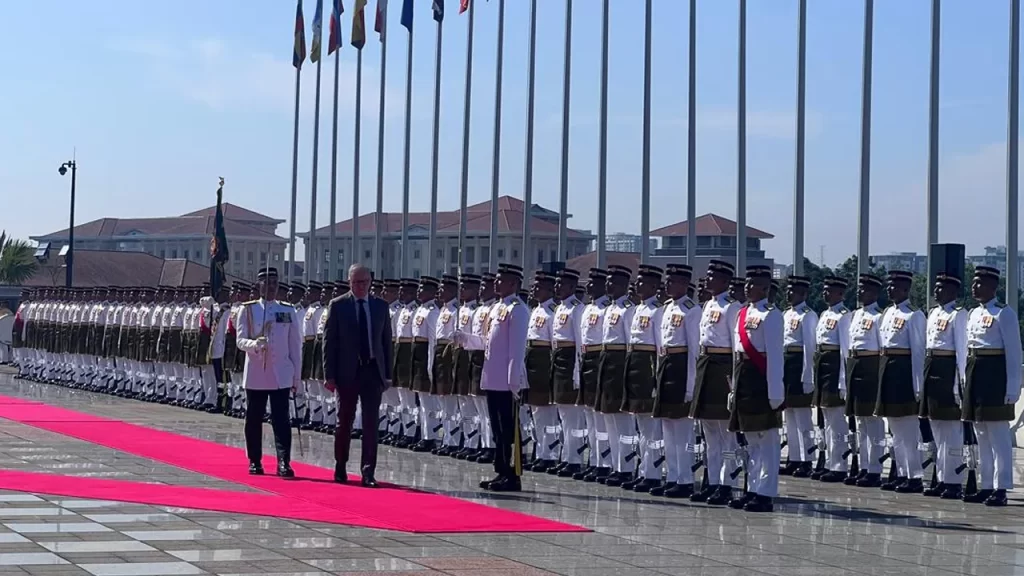 அவர் காலை 9.56 மணியளவில் வந்தடைந்தபோது, PM Anwar Ibrahim அவர்களால் வரவேற்கப்பட்டார். நிகழ்ச்சி, இரு நாடுகளின் தேசிய கீதங்கள் ஒலிக்கப்பட்டதுடன் தொடங்கியது. அதன்பின், Anthony Albanese kawalan kehormatan அணிவகுப்பை பரிசோதித்தார். இதில் Batalion Pertama Rejimen Askar Melayu Diraja (Istiadat) உறுப்பினர்கள் கலந்து கொண்டனர்.